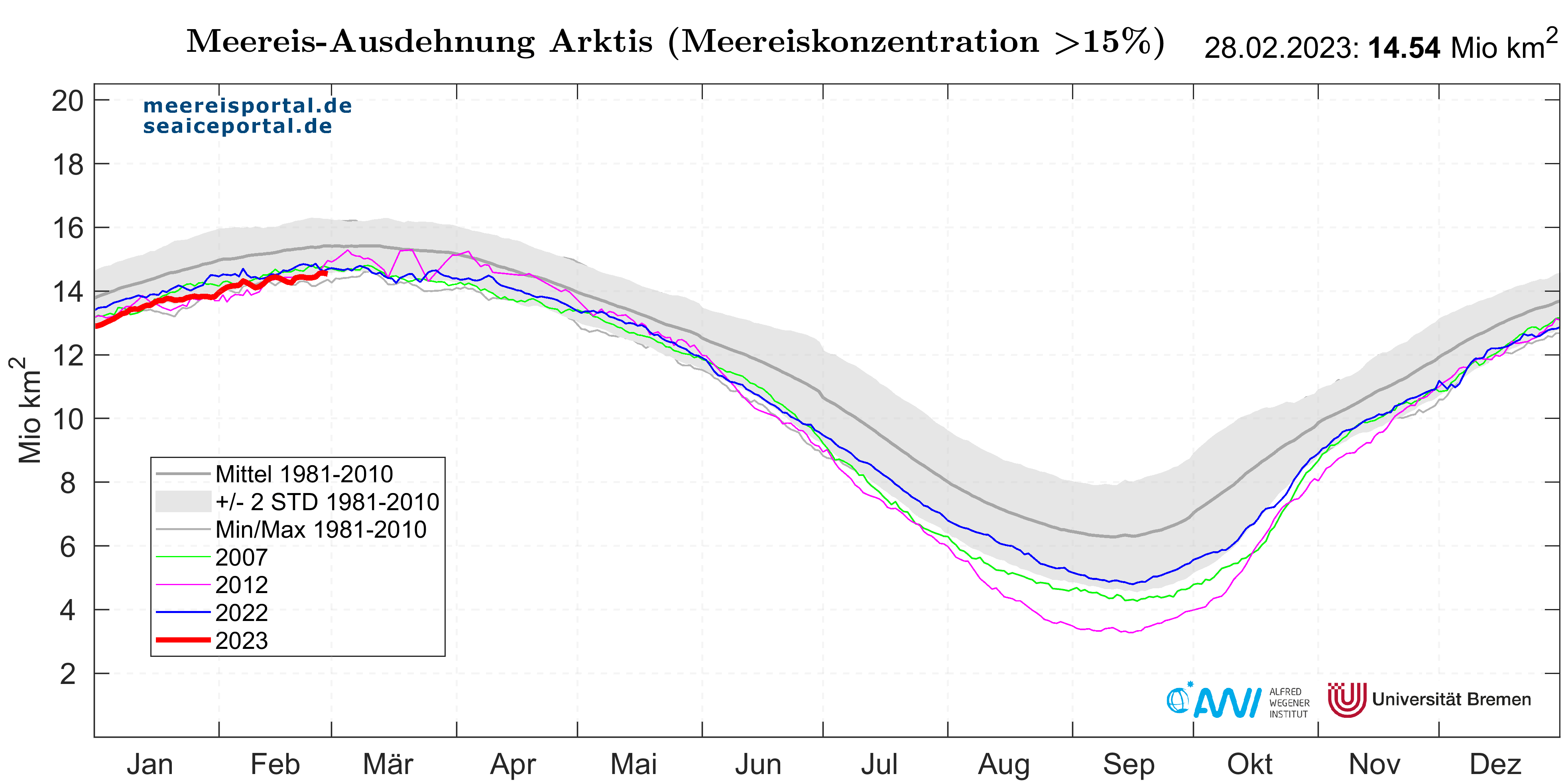 Bleibt zu erwähnen, dass auch die Meereisflächen (extent) der Arktis kräftig wachsen und mit 6,25 Mill. km² deutlich über den Werten mehrerer Vorjahre liegen.