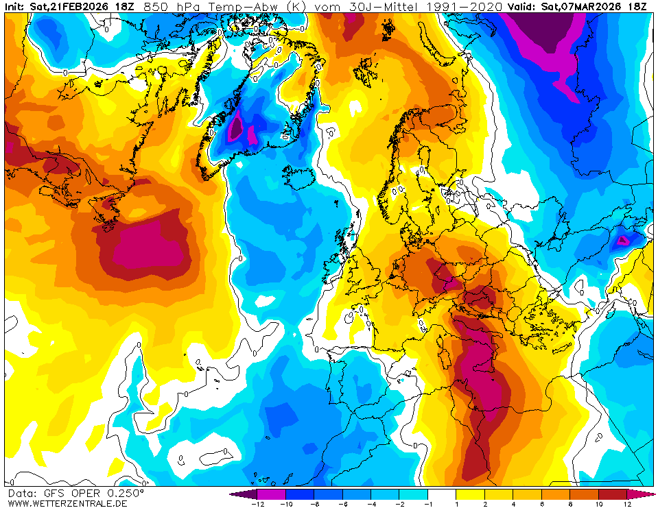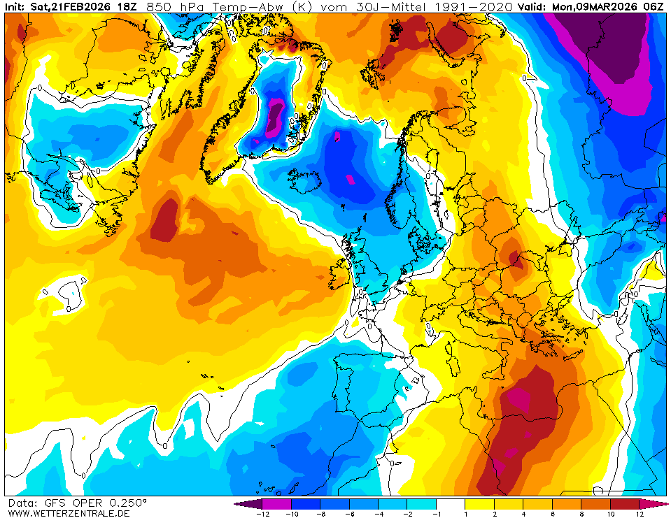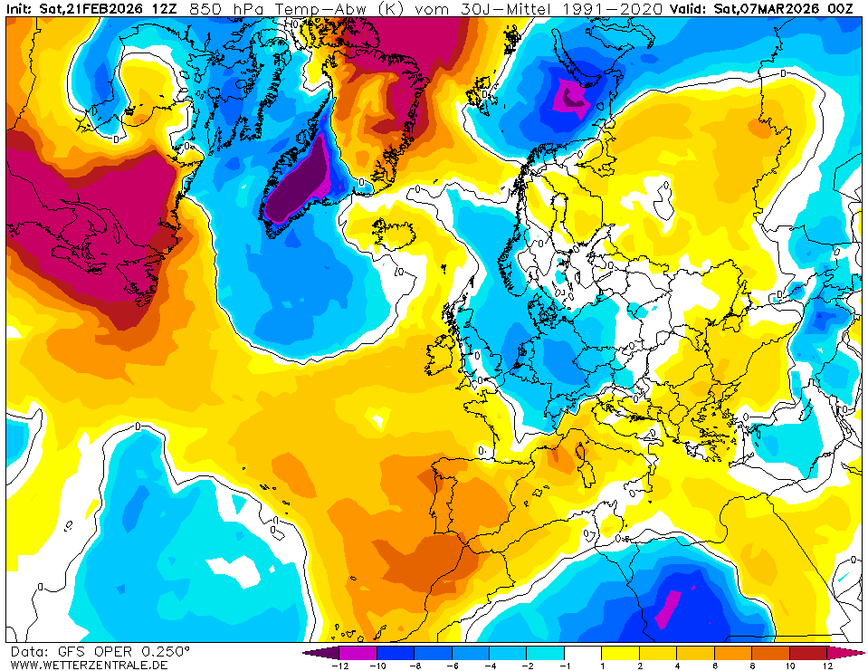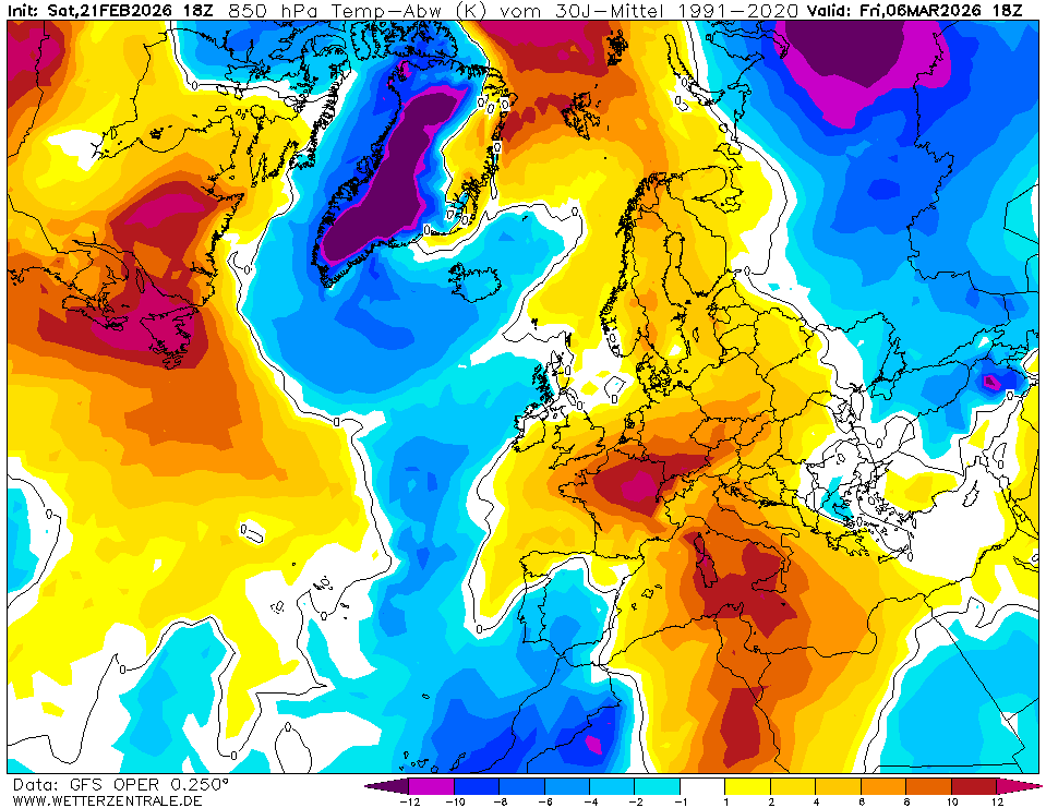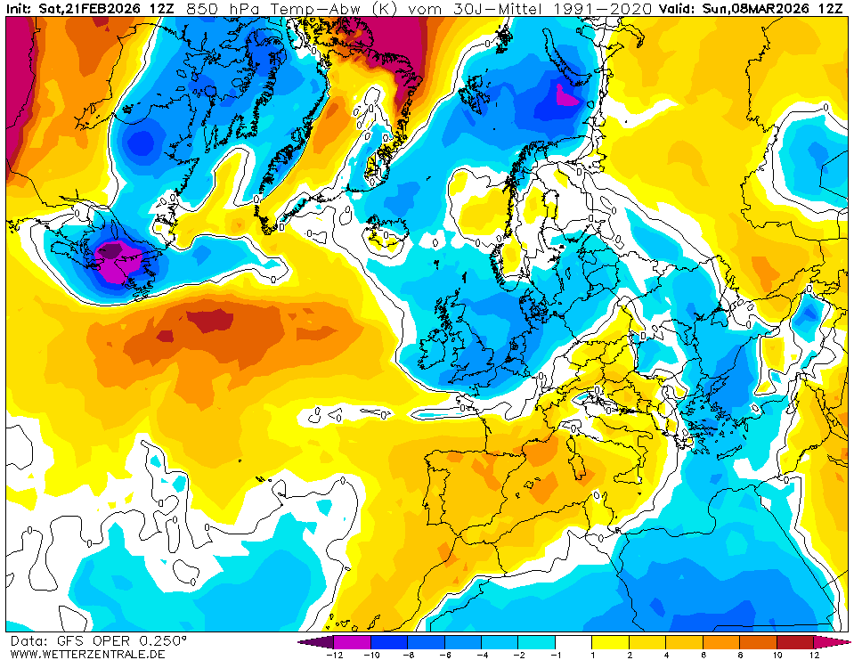 Zum Vergrößern anklicken. GFS-Prognose vom 16.2.2019 für die Temperaturabweichungen zum seit 2015 weltweit verbindlichen WMO-Klimamittel 1981-2010 zum Monatswechsel. Zwischen hohem Druck über dem östlichen Nordatlantik und einem umfangreichen kalten Tiefdrucksystem von Osteuropa bis Südeuropa strömt russische Kaltluft nach Südwesten über Mitteleuropa bis nach Spanien und nach Nordafrika. Bei Eintreffen dieser Rechnungen ist um den Monatswechsel Februar/März 2019 mit winterlichen Verhältnissen bis in tiefere Lagen zu rechnen. Quelle: Wetterzentrale