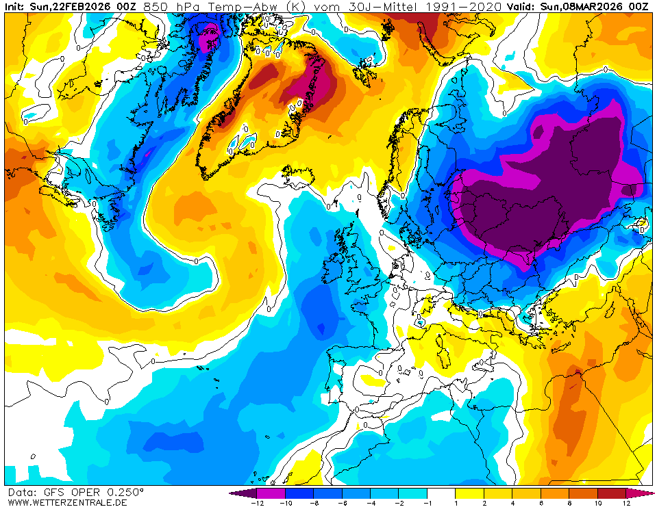 Zum Vergrößern anklicken. Die GFS-Prognose vom 6.8.2019 für den Herbsteinbruch am 15.8.2019 in Europa als Strömungsfilm mit hochreichender Kaltluft bis zu -25° C in 5500m Höhe (500 hPa). Quelle wie oben.Zum Vergrößern anklicken. GFS-Prognose vom 6.8.2019 für die Temperaturabweichungen (TA) in rund 1500m Höhe (850 hPa) zum seit 2015 weltweit verbindlichen WMO-Klimamittel 1981-2010 in Europa am 16.8.2019: Eine ungewöhnliche Kältewelle mit Abweichungen bis zu -12°C hat die Westhälfte Europas erfasst. Bei Eintreffen dieser für Mitte August extrem kalten Wetterlage ist mit Schneefällen vor allem im Alpenraum bis unter 1500m zu rechnen. Eine Fortsetzung der ersten drei kalten Juliwochen 2019 in großen Teilen Europas und eine Bestätigung der kalten Siebenschläferwoche…? Quelle: WZ/GFS-Prognose TA 850 EuropaZum Vergrößern anklicken. WO/GFS-Prognose vom 6.8.2019 für kräftige Schneefälle im Alpenraum am 15.8.2019 weisen weiter auf einen frühzeitigen Herbstbeginn 2019 und einen eher unterkühlten August hin. Eine Fortsetzung der ersten drei kalten Juliwochen 2019 in großen Teilen Europas und eine Bestätigung der kalten Siebenschläferwoche…? Quelle: WO/GFS-Schneefallprognosen